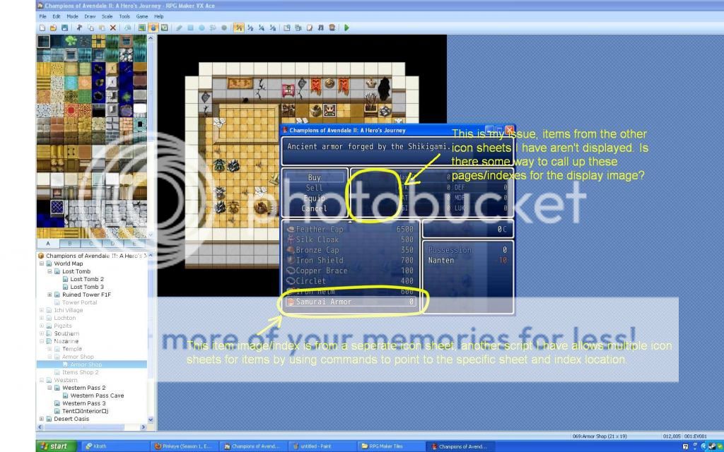 This works pretty well for me however I’ve run into a small snag with another script I am using. The other script allows the use of multiple icon files, the icon appears in the shop and other menus but as you can see from the image below the enlarged display made by the Shop Options script does not display items from my other sheets.